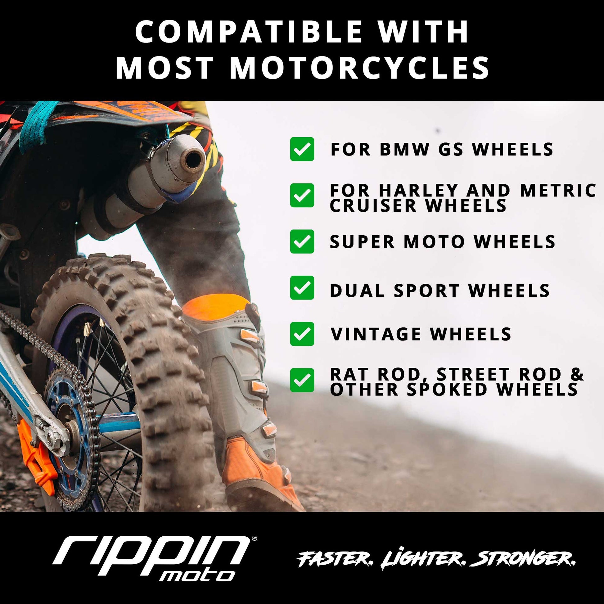 Universal fitment suitable for Enduro, Super Moto and Dual-Sport motorcycles. Compatible with Harley-Davidson, KTM, Suzuki, BMW GS models, vintage, or any other spoked wheels.