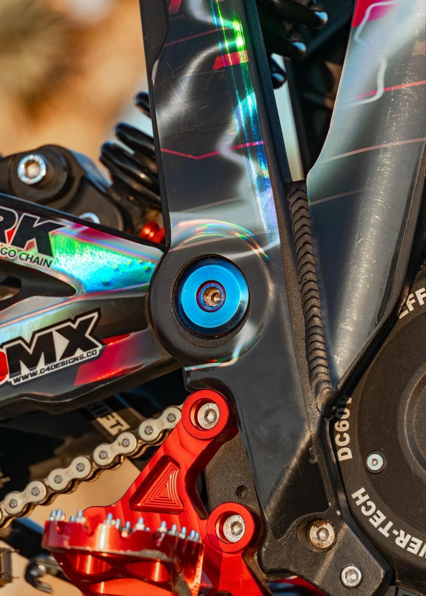 Custom titanium swingarm bolts for Talaria MX3 and MX4.